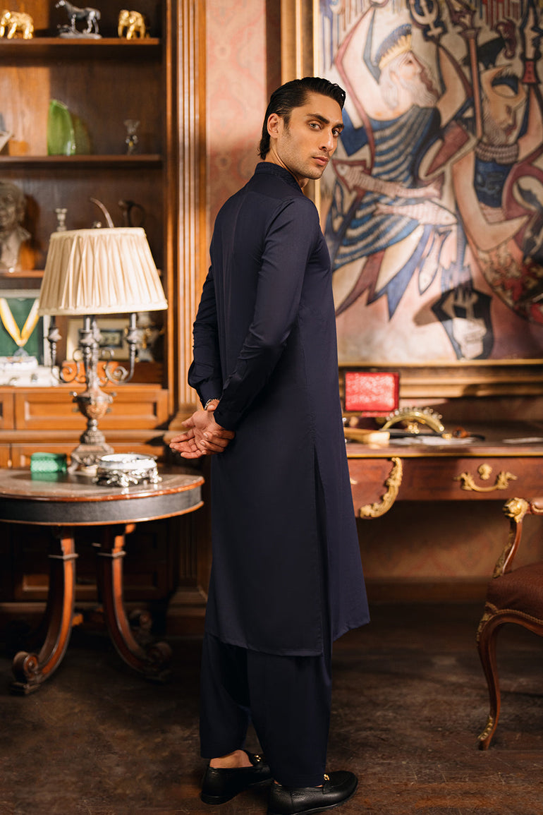 This Beacon Blue shalwar kameez, paired with a matching waistcoat, offers a refined and elegant look. Featuring a 3D hand braided collar and placket, it adds a touch of regal charm. Perfect for formal gatherings, weddings, and special occasions, it seamlessly blends tradition with modern sophistication.