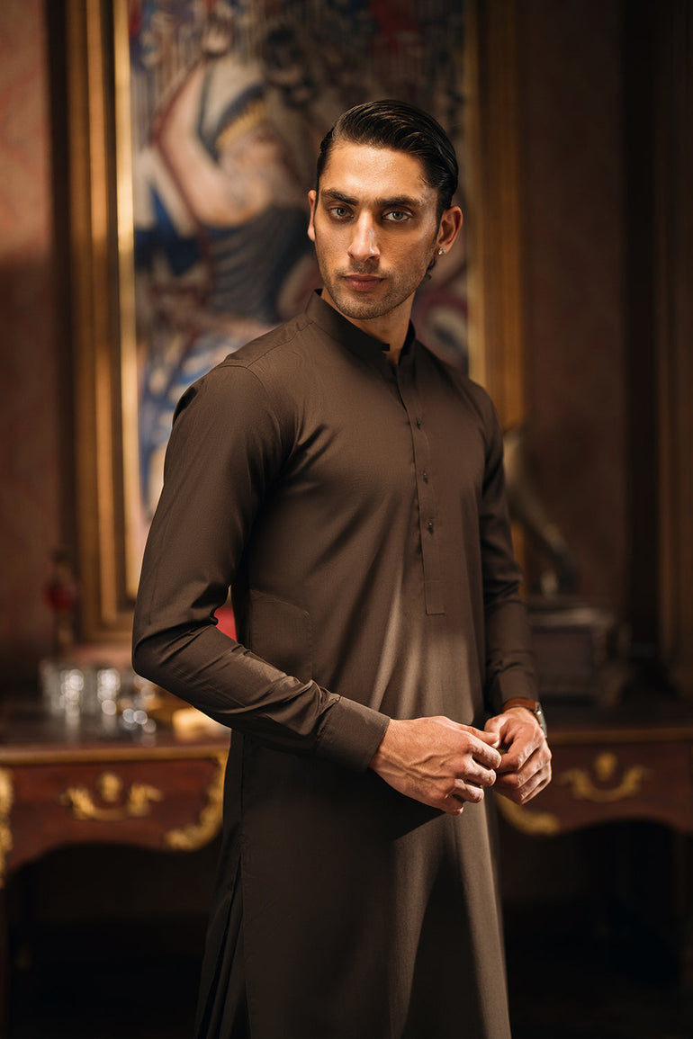 This Cocoa brown shalwar kameez combines sophistication with a timeless appeal. Crafted from high-quality fabric, its sleek and minimalistic design makes it perfect for formal gatherings, business events, and cultural occasions. A perfect blend of comfort and elegance