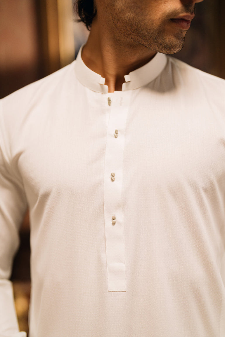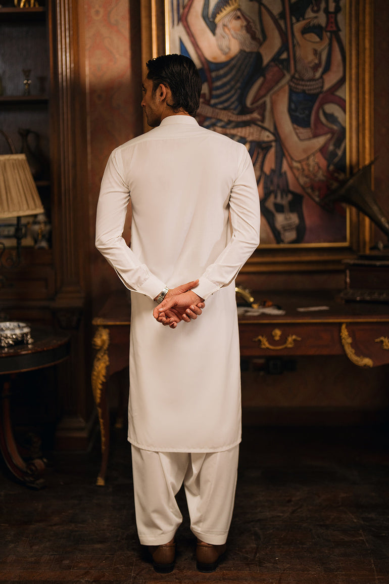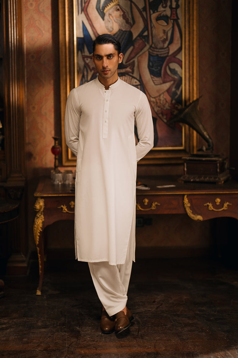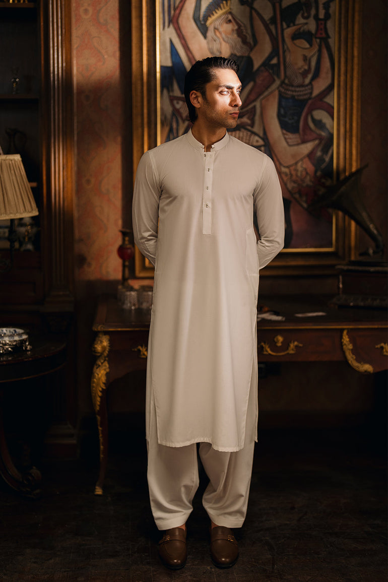 This off-white shalwar kameez exudes elegance with its simple yet sophisticated design. Crafted from premium fabric, it offers a polished and refined look, making it perfect for formal occasions, cultural gatherings, and everyday wear.