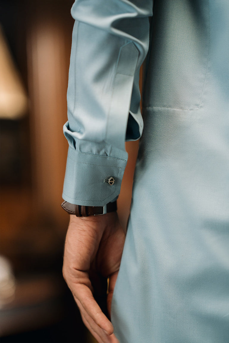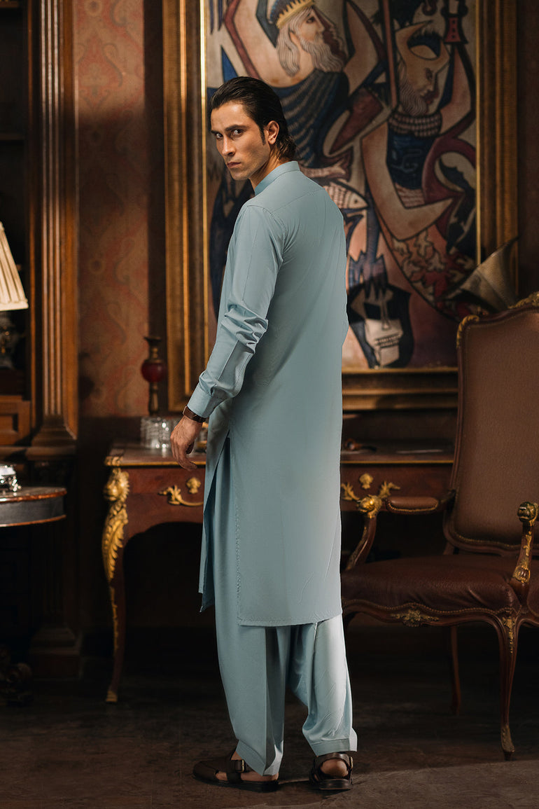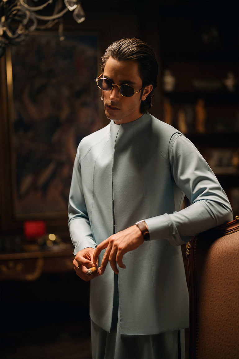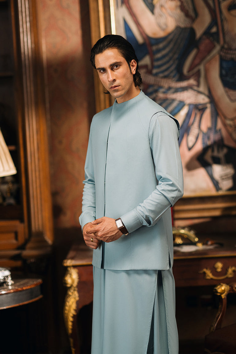 This refined silt green shalwar kameez is paired with a matching waistcoat, creating a sophisticated and elegant look. Perfect for weddings, festive gatherings, and formal occasions, it blends traditional charm with modern style.