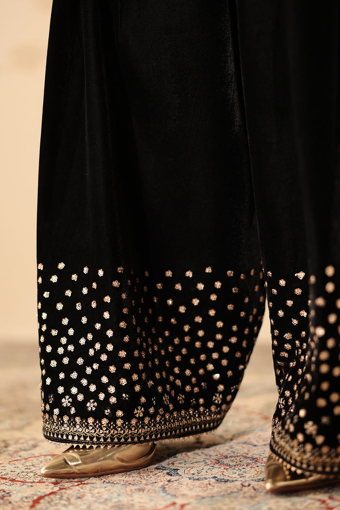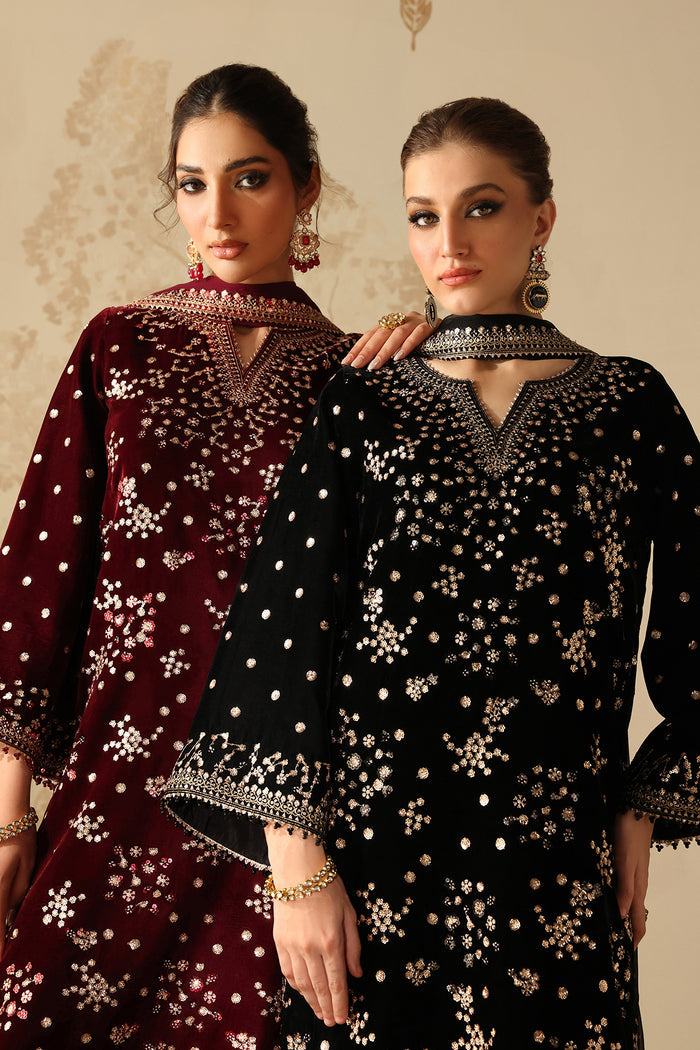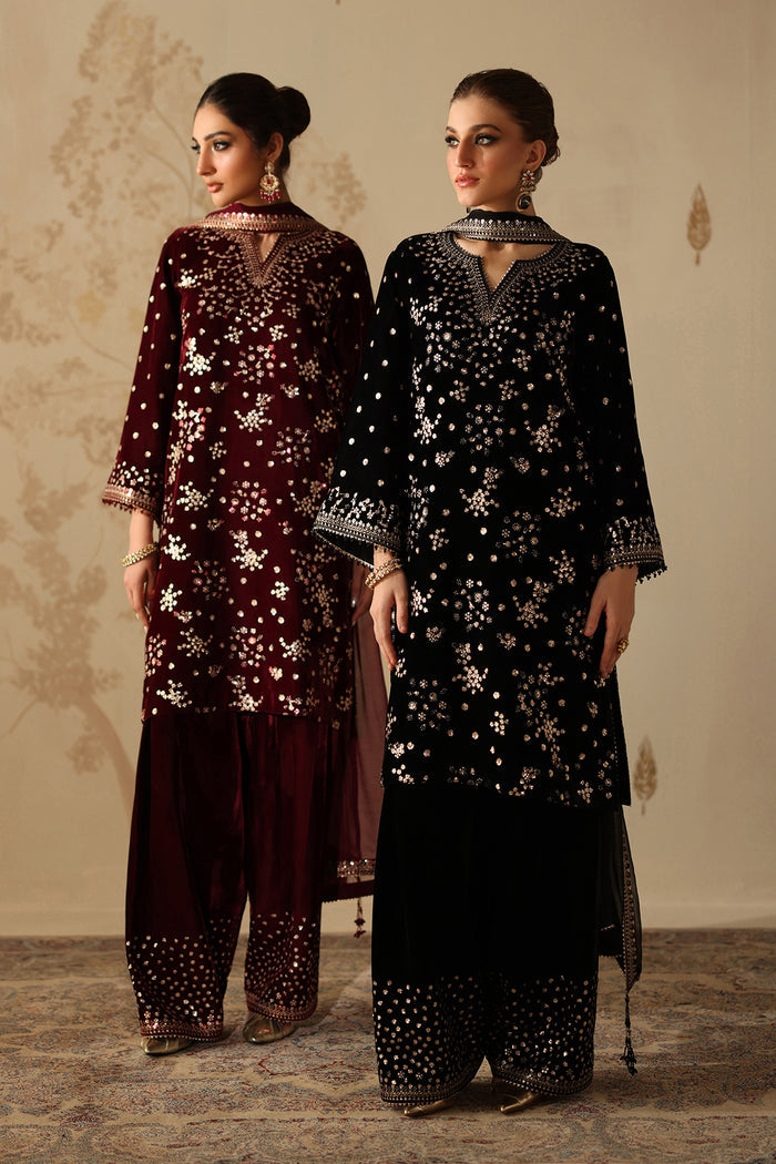Fabric details: Embroidered velvet shirt, dyed & embroidered chiffon dupatta, embroidered velvet farshi shalwar