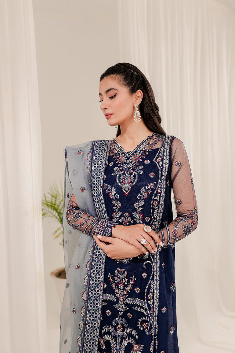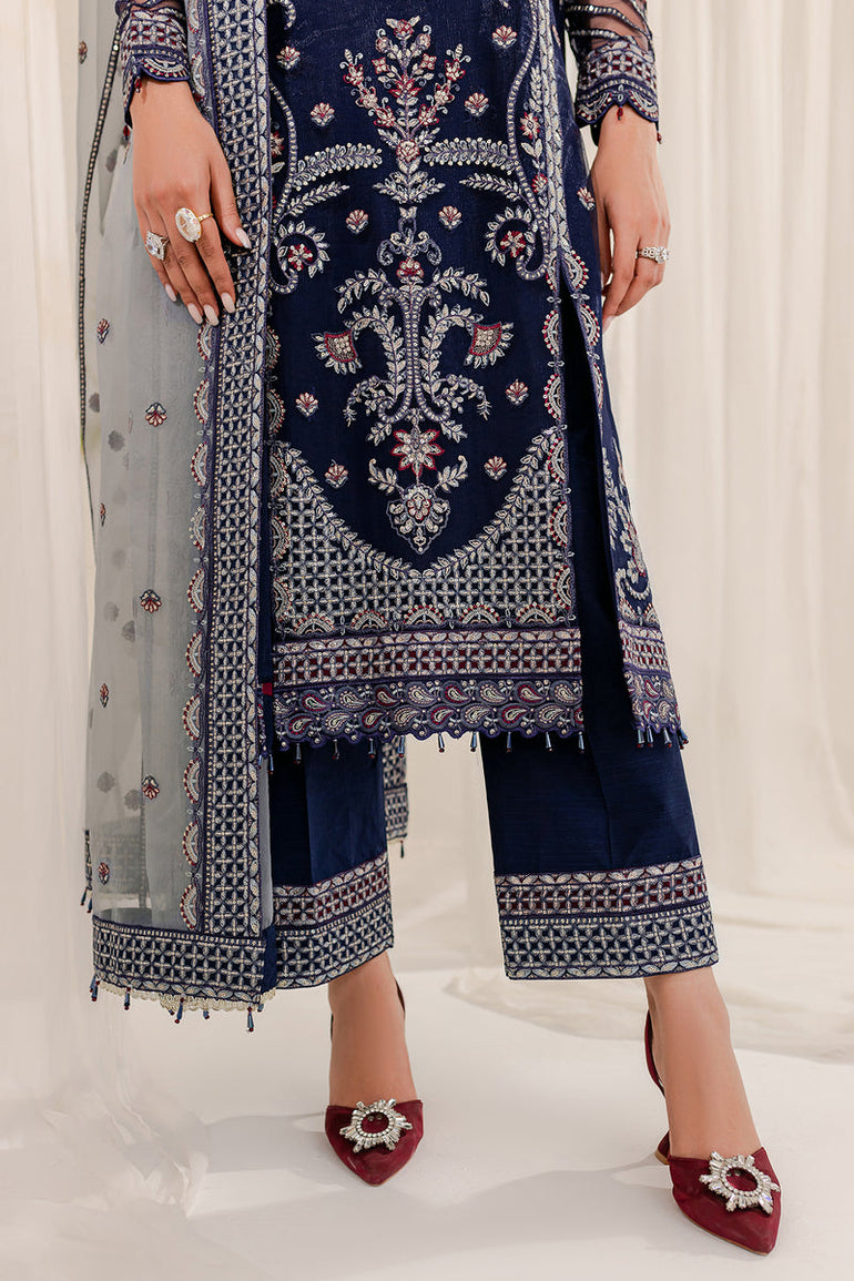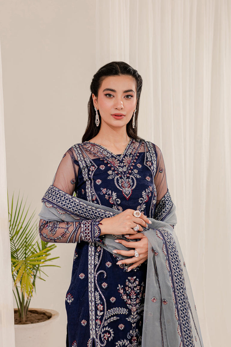 Fabric details: Embroidered net shirt, embroidered organza dupatta, dyed raw silk trousers