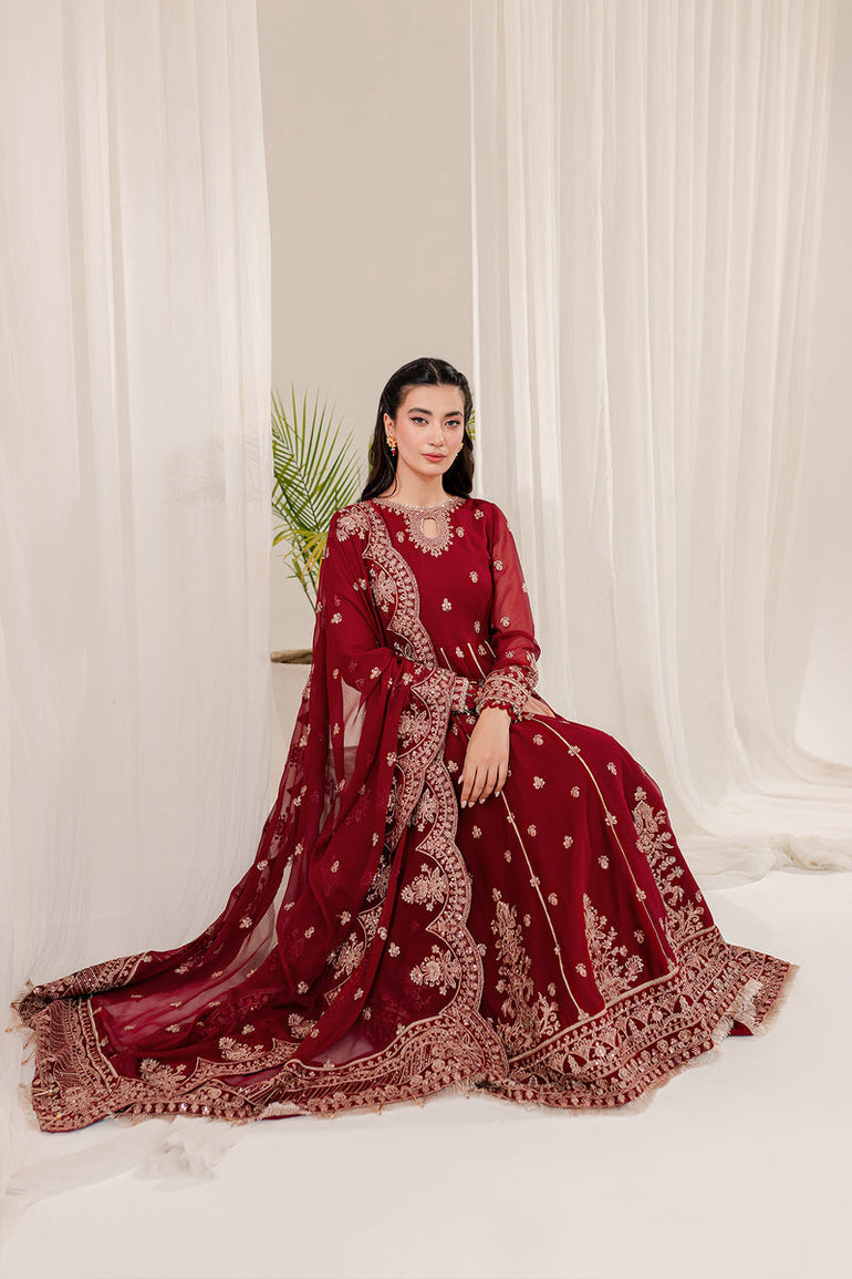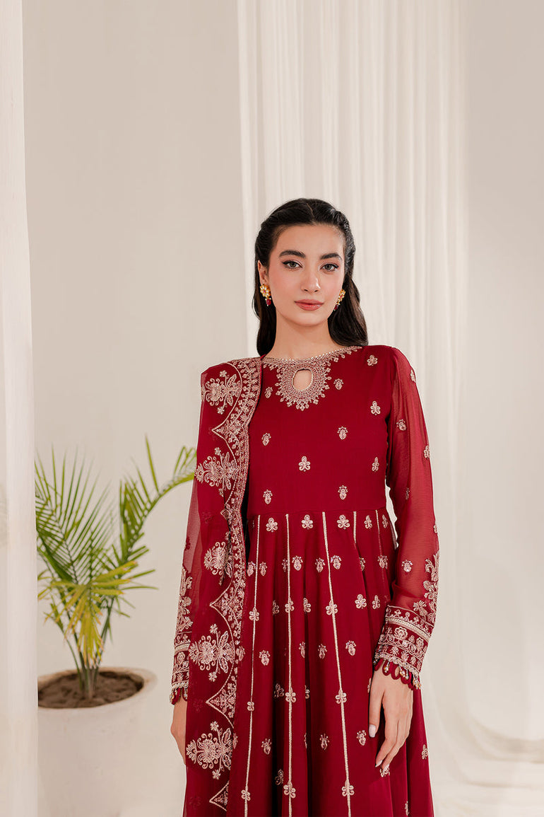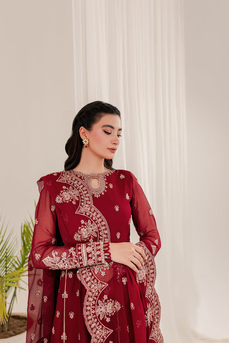 Fabric details: Embroidered chiffon shirt, embroidered chiffon dupatta, dyed raw silk trousers