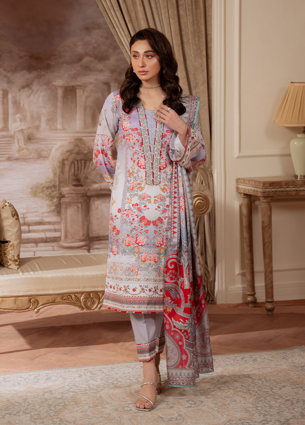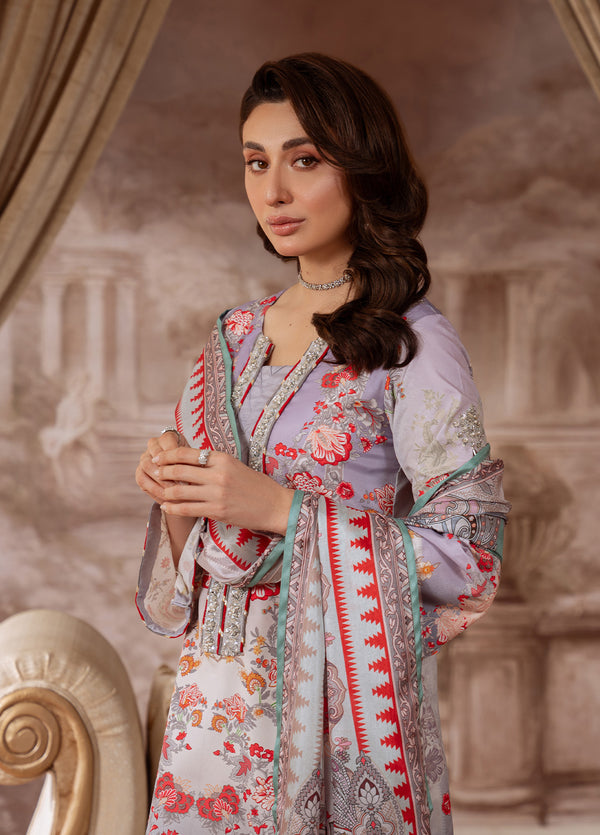 Fabric details: Hand embellished, embroidered and sequined printed silk shirt, printed silk dupatta, printed silk pants