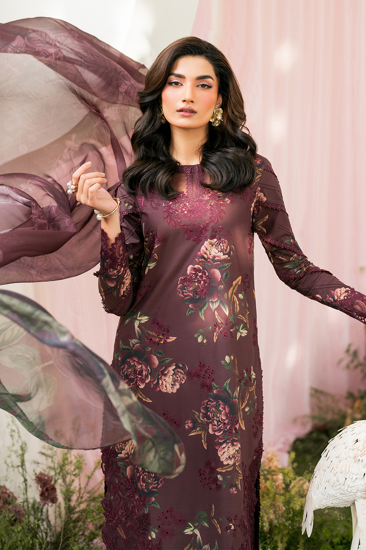 Fabric details: Printed borer embroidered lawn shirt, printed silk dupatta, printed lawn trousers.