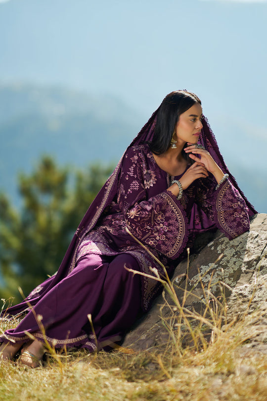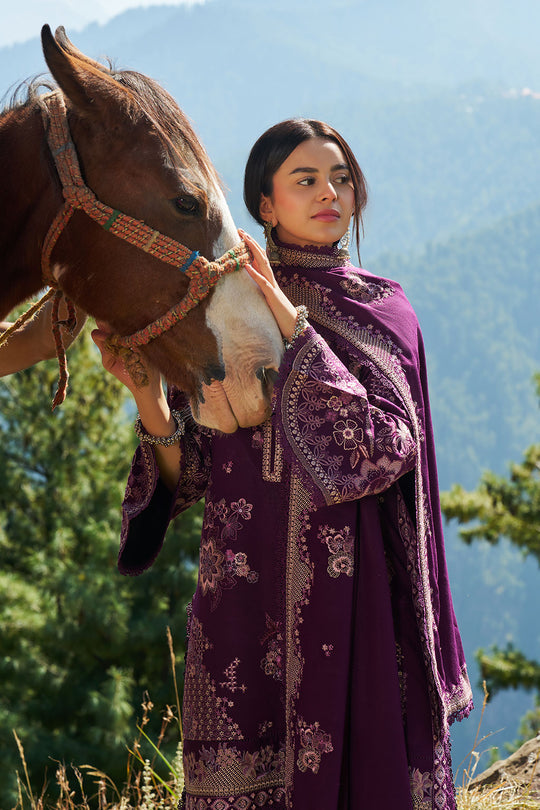 Fabric details: Embroidered karandi shirt, embroidered pashmina shawl, dyed karandi trousers