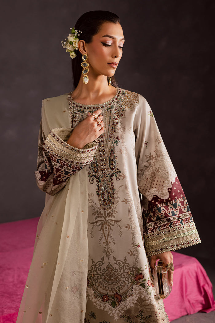 Embroidered and printed silk shirt, embroidered organza dupatta, printed silk trouser