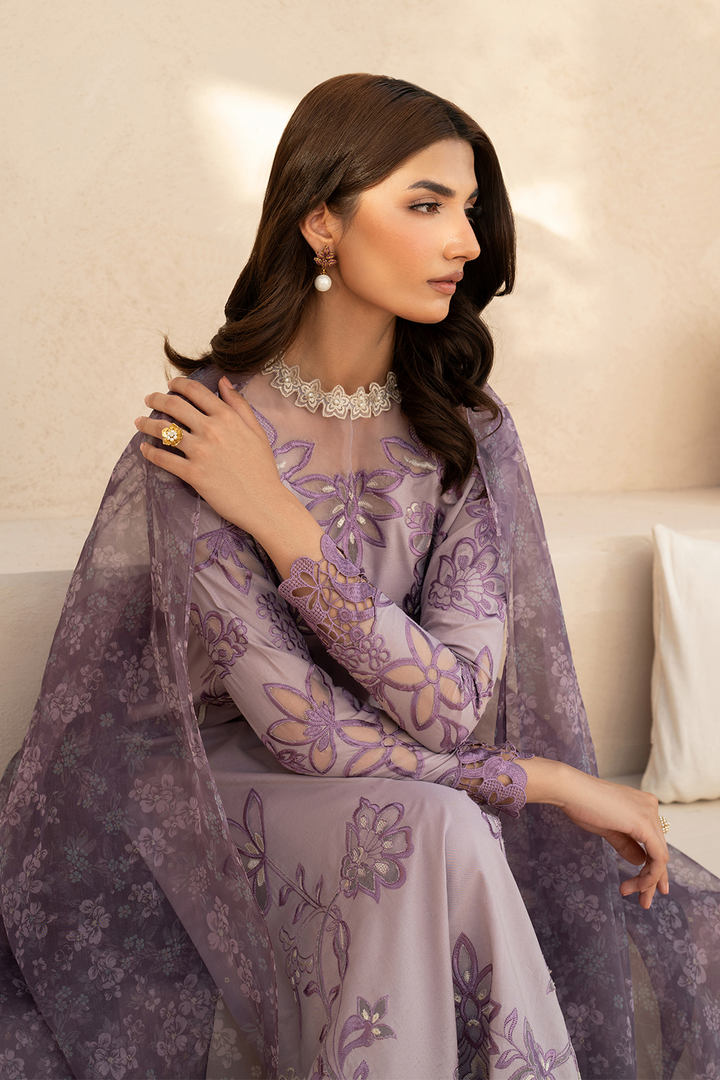 Fabric details: Embroidered laser cut lawn shirt, printed organza dupatta, dyed cambric trousers.