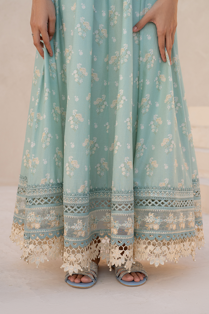 Fabric details: Printed embroidered lawn frock, printed silk dupatta, dyed cambric trousers.