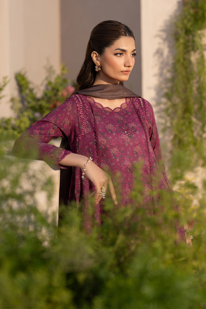 Fabric details: Printed borer embroidered lawn frock, printed silk dupatta, printed lawn trousers.