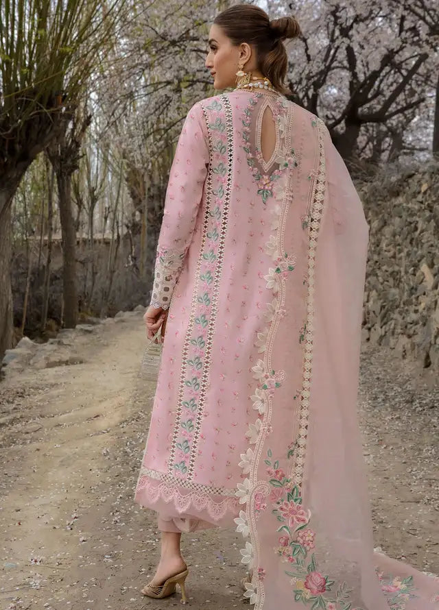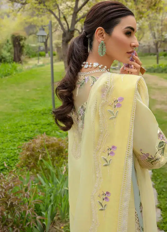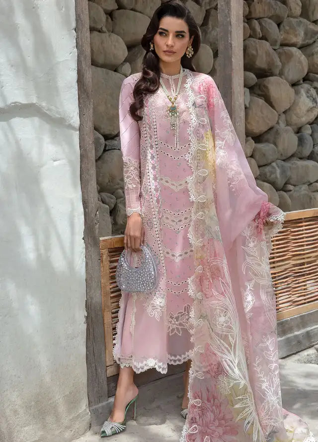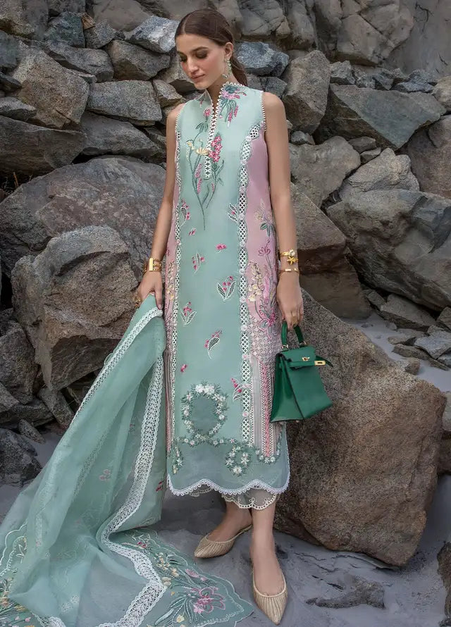 Three piece embroidered lawn suits with embroidered woven net dupattas stitched & embellished by Blossoms by Azz.