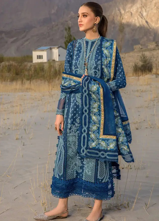 Fabric details: Hand printed embroidered lawn shirt, dyed embroidered woven net dupatta, hand printed cotton pants