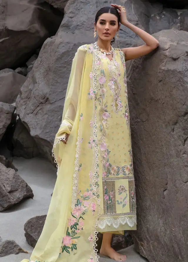 Fabric details: Embroidered lawn shirt, dyed embroidered woven net dupatta, dyed embroidered cotton pants