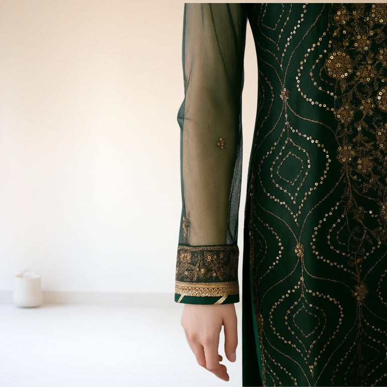 Description: This pretty green suit by Asim Jofa has nice embroidery work. It comes with a light net dupatta and comfy silk pants. Looks great for special events or parties. Stitched by our professional tailor. We can also add lining in sleeves on customer’s requests.