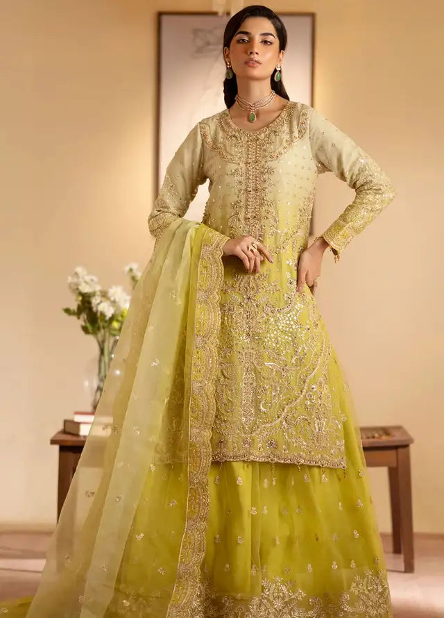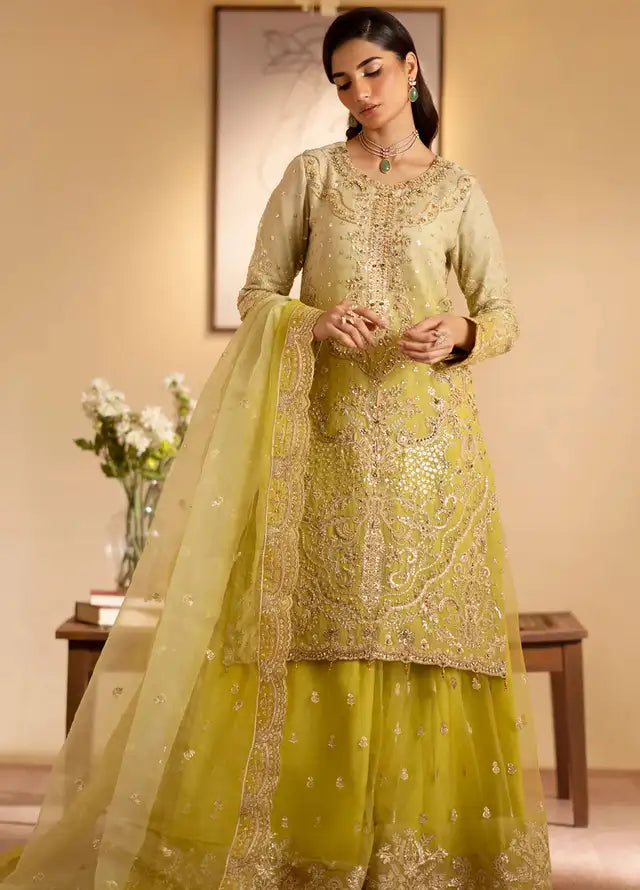 Fabric details: Embroidered hand made organza shirt, embroidered organza dupatta, net embroidered sharara