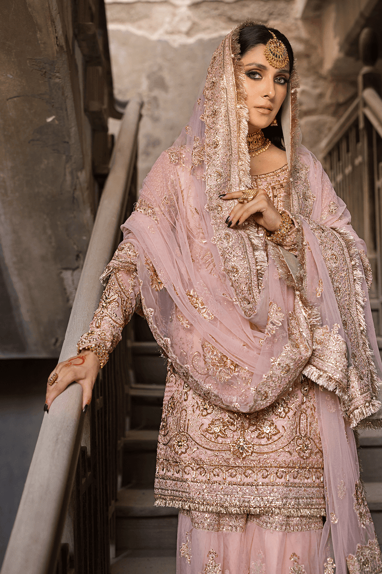 Fabric details: Embroidered and hand embellished net shirt, embroidered net dupatta, embroidered net gharara with cotton silk lining