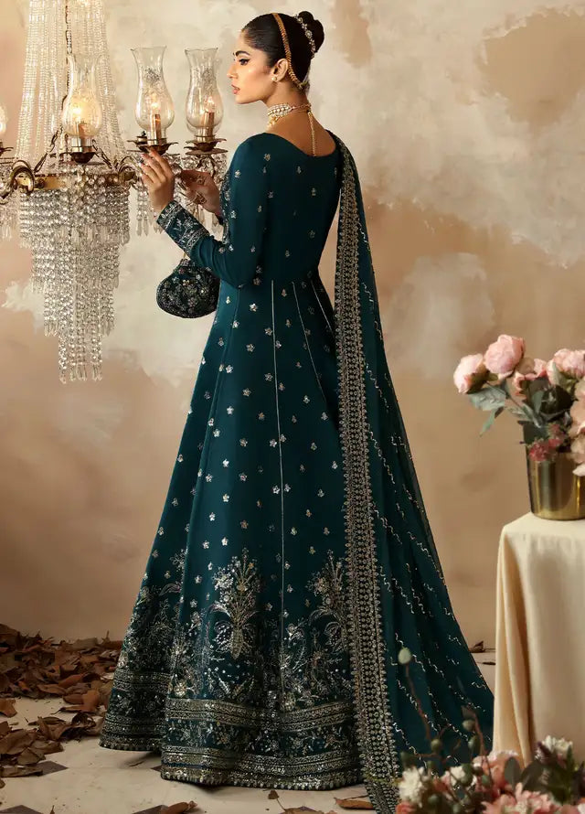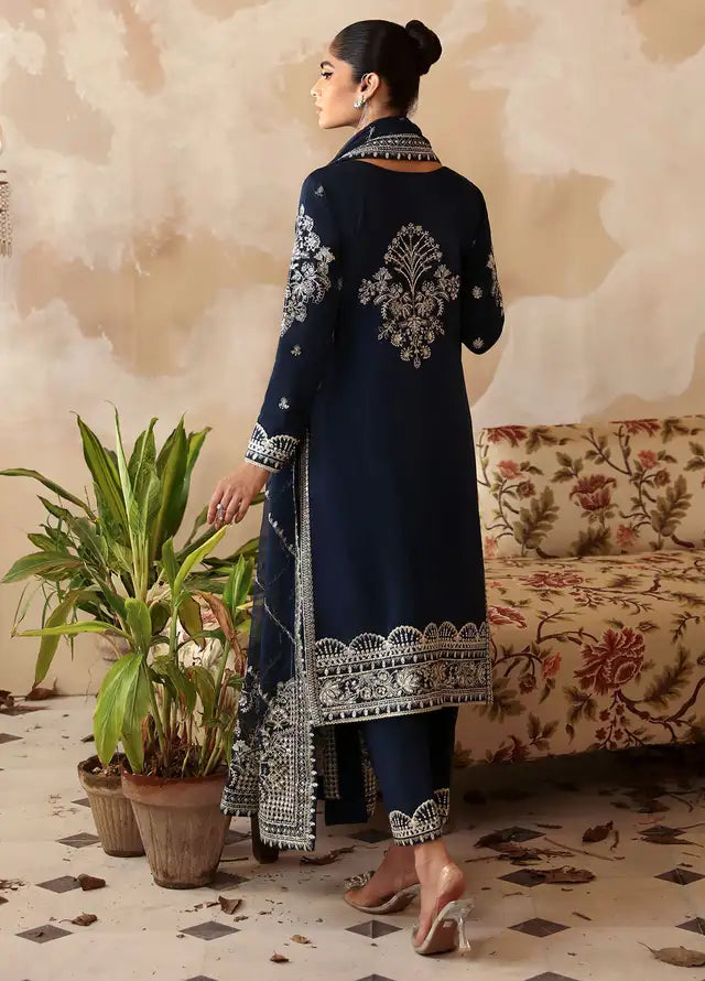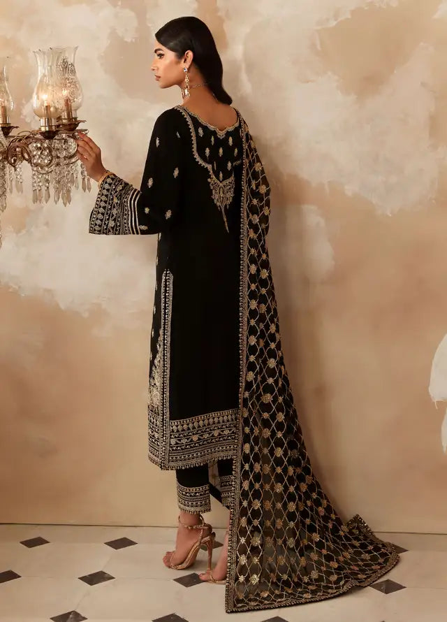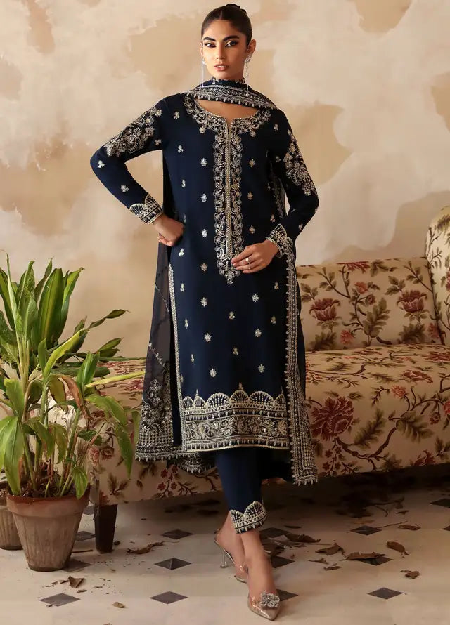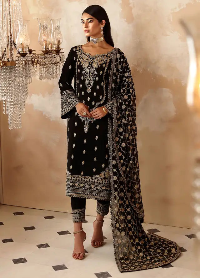 The collection includes a variety of stitched three piece embroidered and sequined silk suits with embroidered chiffon / organza dupattas from latest volume at a very affordable price.