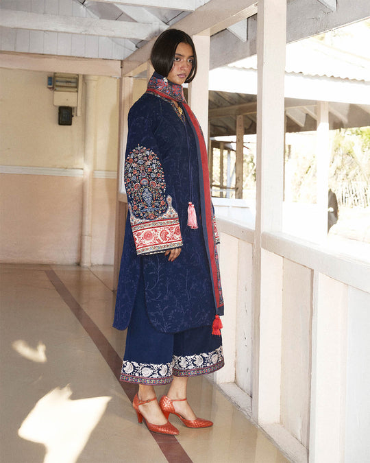 Fabric details: Embroidered khaddar shirt, digital printed wool shawl, dyed embroidered khaddar trousers,