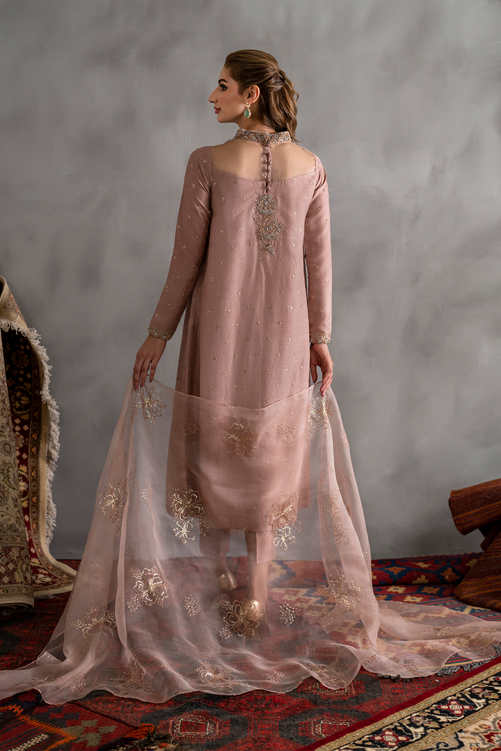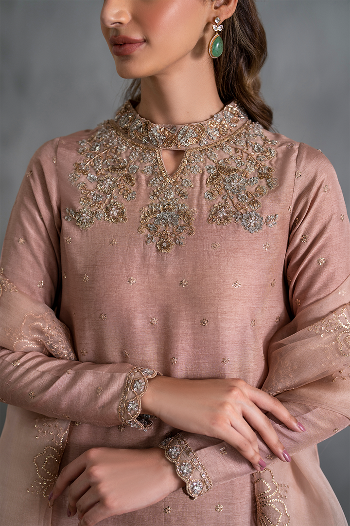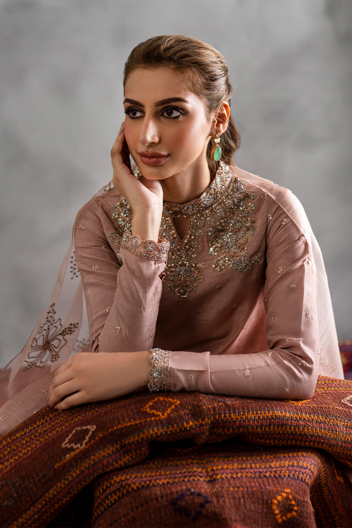 Fabric details: Dyed embroidered raw silk shirt, embroidered organza dupatta, dyed embroidered raw silk trousers