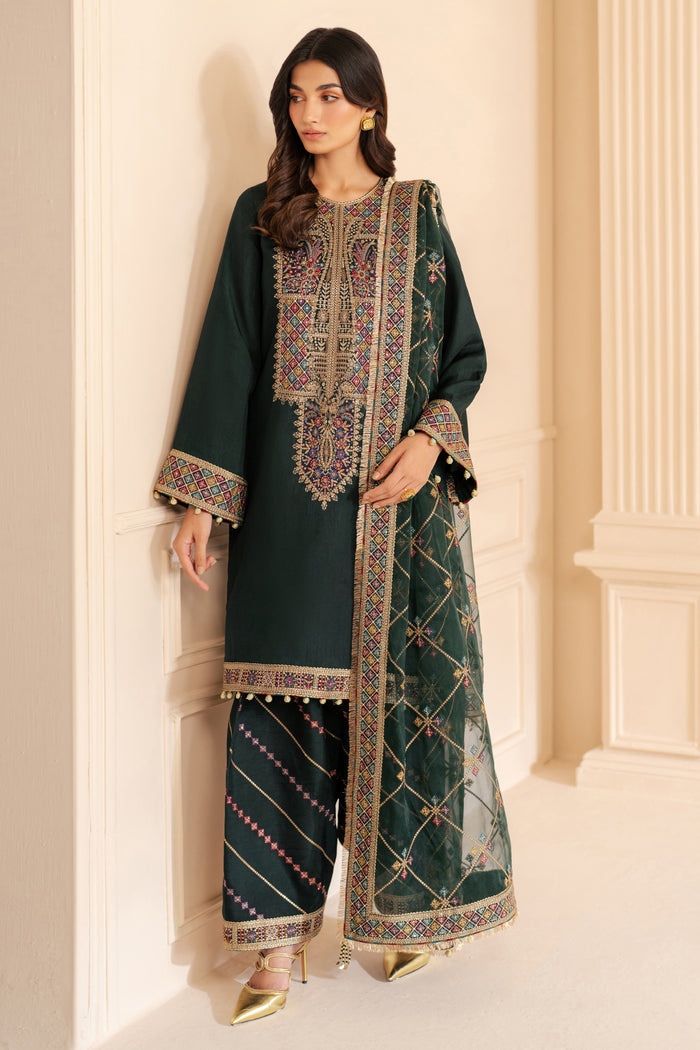 The collection includes a variety of stitched three piece embroidered chiffon / raw silk suits with embroidered chiffon / organza / tissue silk dupattas from latest volume at a very affordable price.