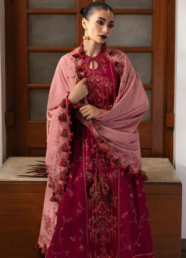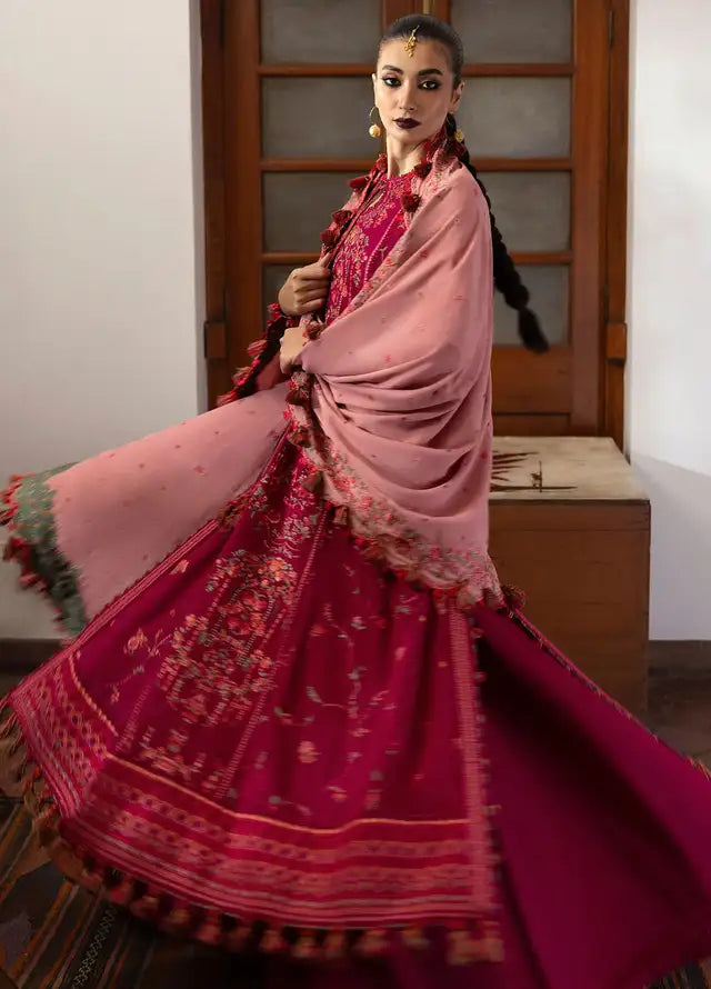 Fabric details: Embroidered karandi shirt, embroidered karandi shawl, dyed karandi trousers