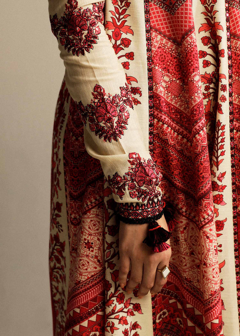 Fabric details: Embroidered khaddar pishwas, digital printed woolen shawl, dyed khaddar trousers