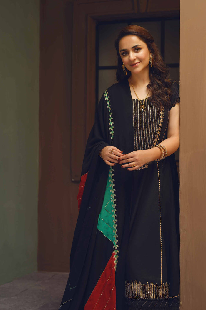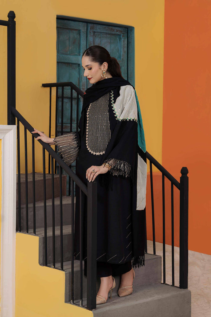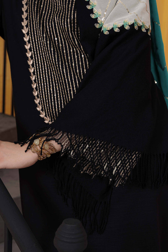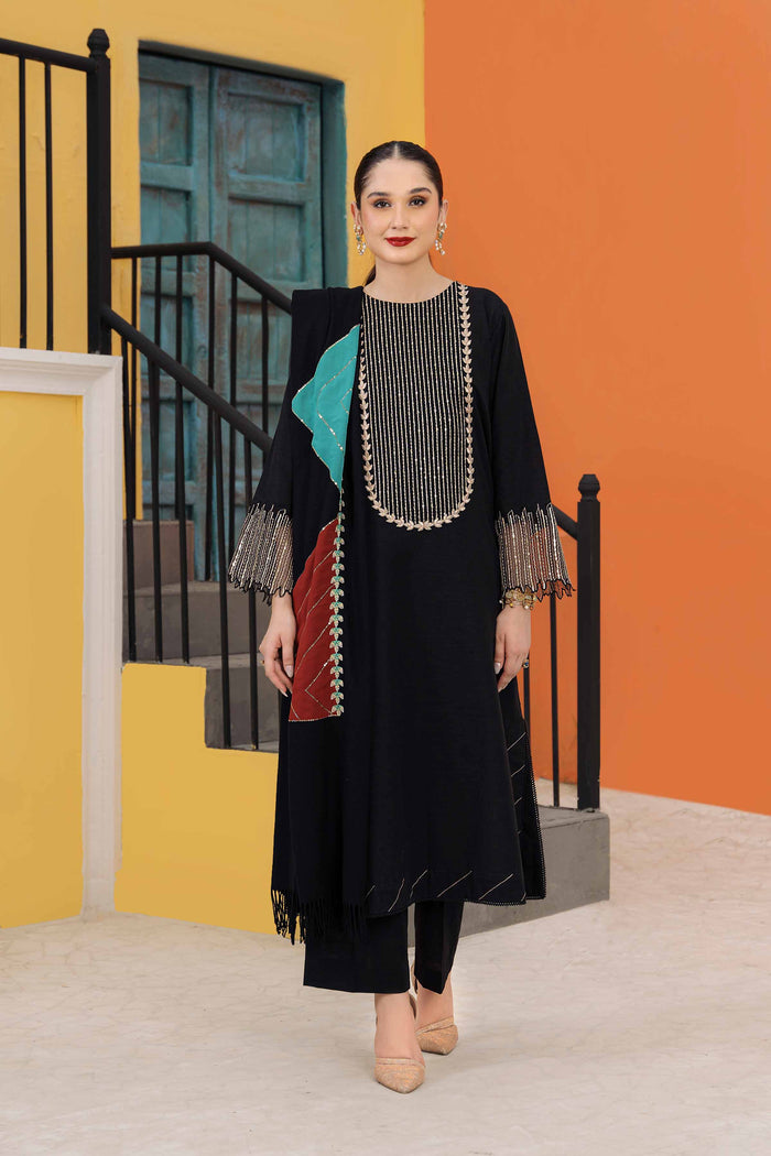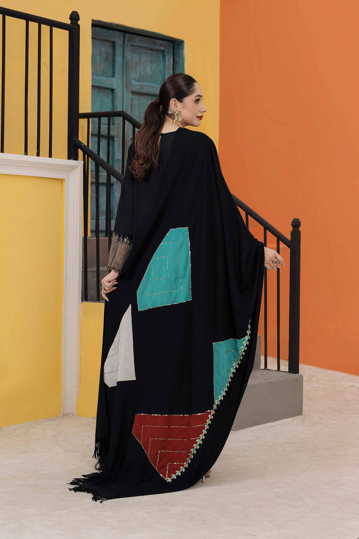 Geometric patches with sequin details khaddar shirt with shawl, dyed khaddar trousers