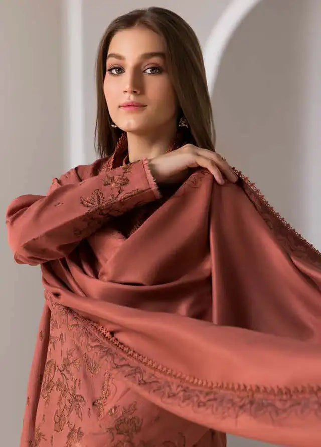 Fabric details: Dyed embroidered khaddar shirt, embroidered twill marina shawl, dyed khaddar trousers