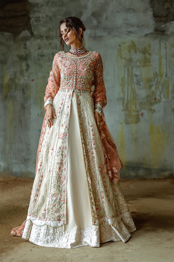 Embroidered, sequinned and hand embellished net maxi, embroidered and sequinned net dupatta, dyed raw silk lehnga