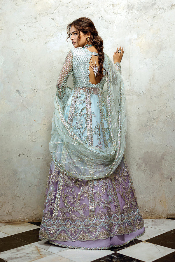 Embroidered, sequinned and hand embellished net maxi, embroidered and sequinned net dupatta, gradient printed lehnga