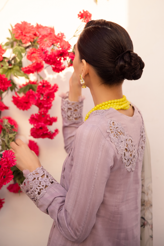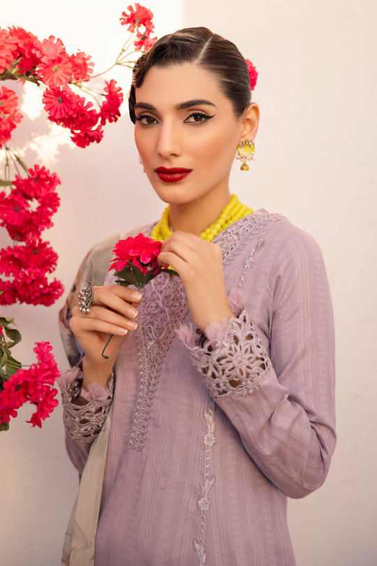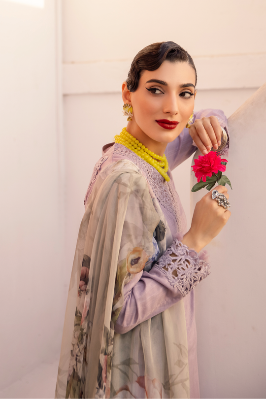 Fabric details: Dyed textured lawn shirt with embroidered organza patches, printed chiffon dupatta, dyed cambric trousers.