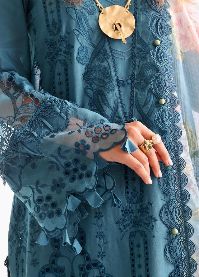 Fabric details: Dyed Schiffli embroidered lawn shirt, printed slub dupatta, dyed cambric trousers