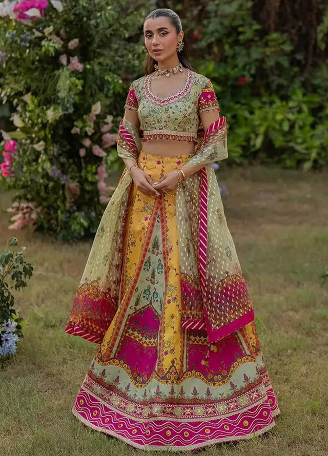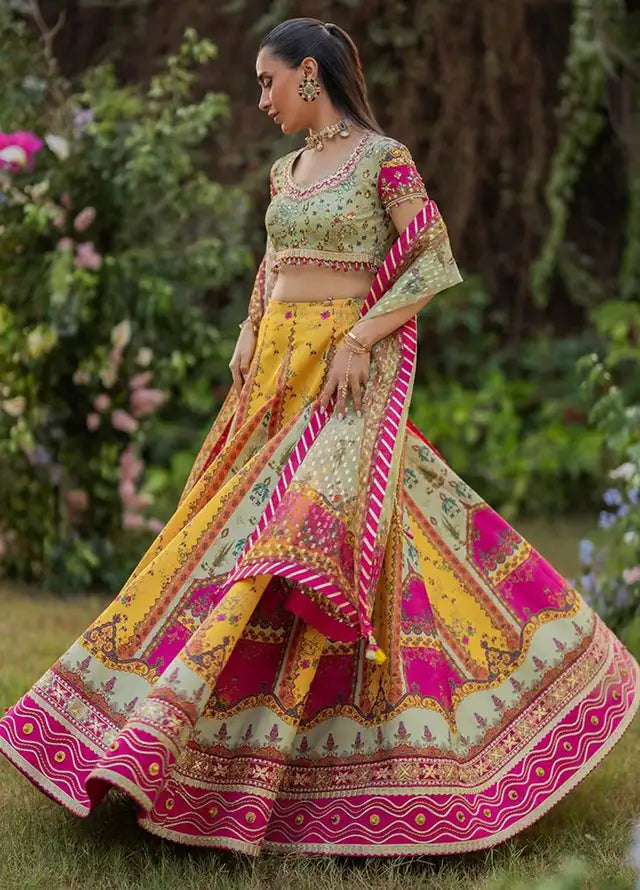 - Digital printed hand made embroidered silk lehnga choli