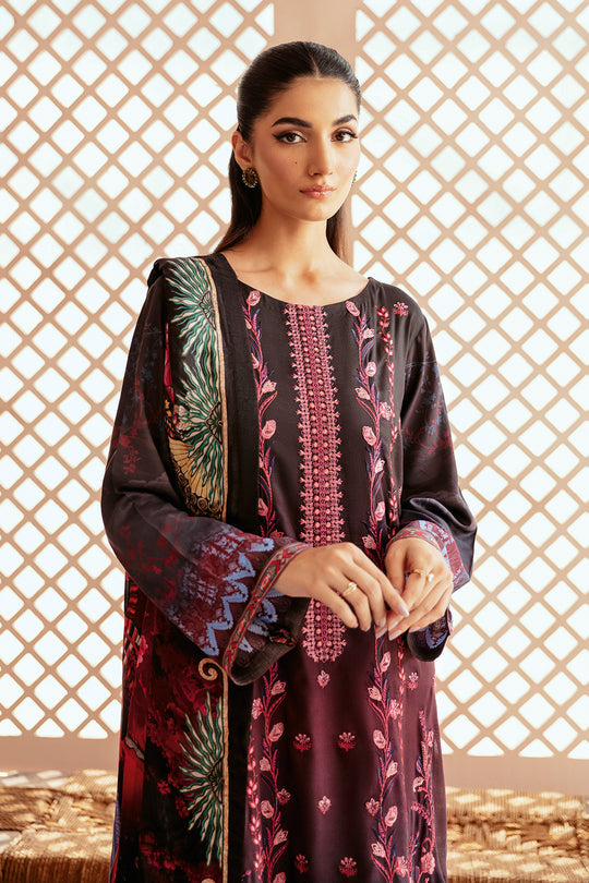 Three piece digital printed embroidered viscose suits with digital printed silk dupattas and printed polyester shawls stitched & embellished by Blossoms by Azz.