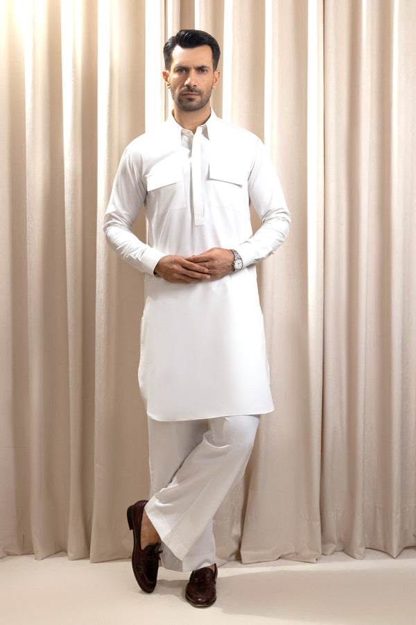 Men’s White Kurta Pajama – Modern Cut with Chest Pockets