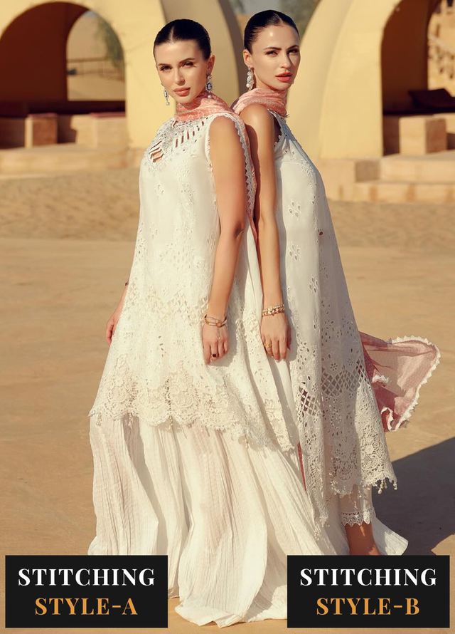 Fabric details: Schiffli and lace cut work embroidered lawn shirt, dyed cambric trousers, digital printed silk dupatta