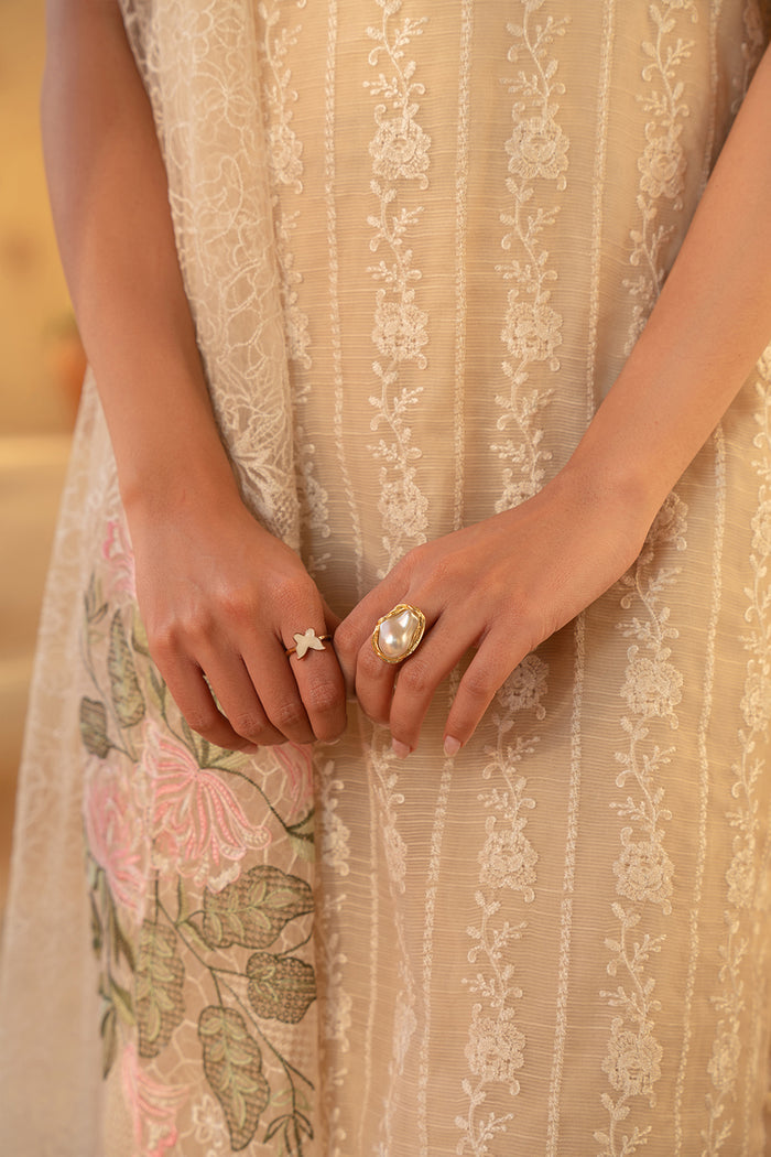 Fabric details: Embroidered textured lawn organza shirt, embroidered net dupatta, plain cambric trousers