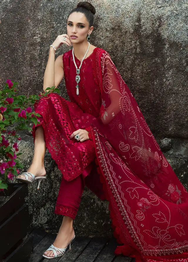 Fabric details: Dyed and embroidered lawn shirt, digital printed chiffon dupatta, dyed cambric trousers