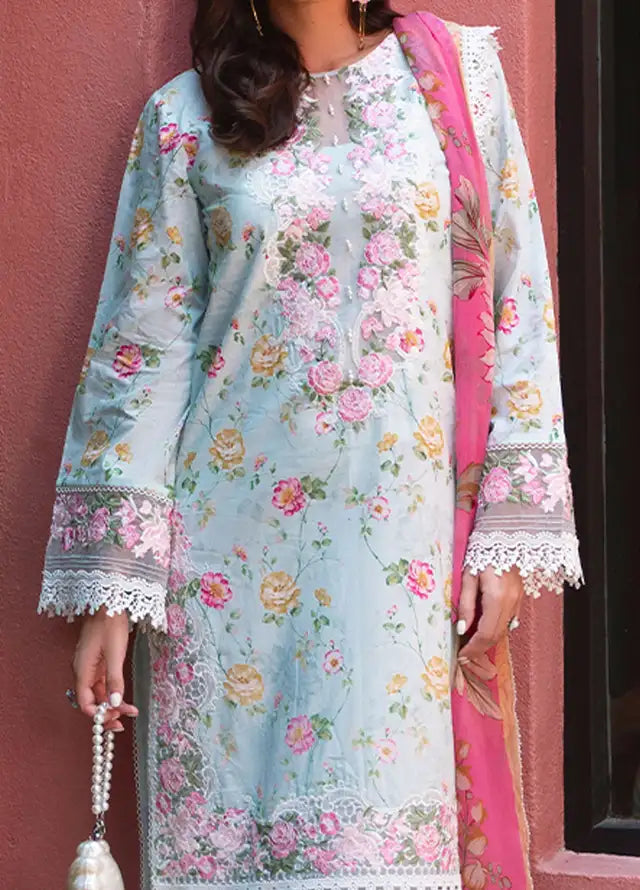 Fabric details: Digital printed embroidered lawn shirt, digital printed chiffon dupatta, dyed and embroidered cambric trousers