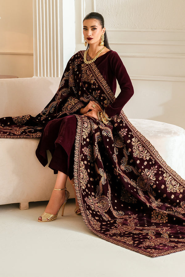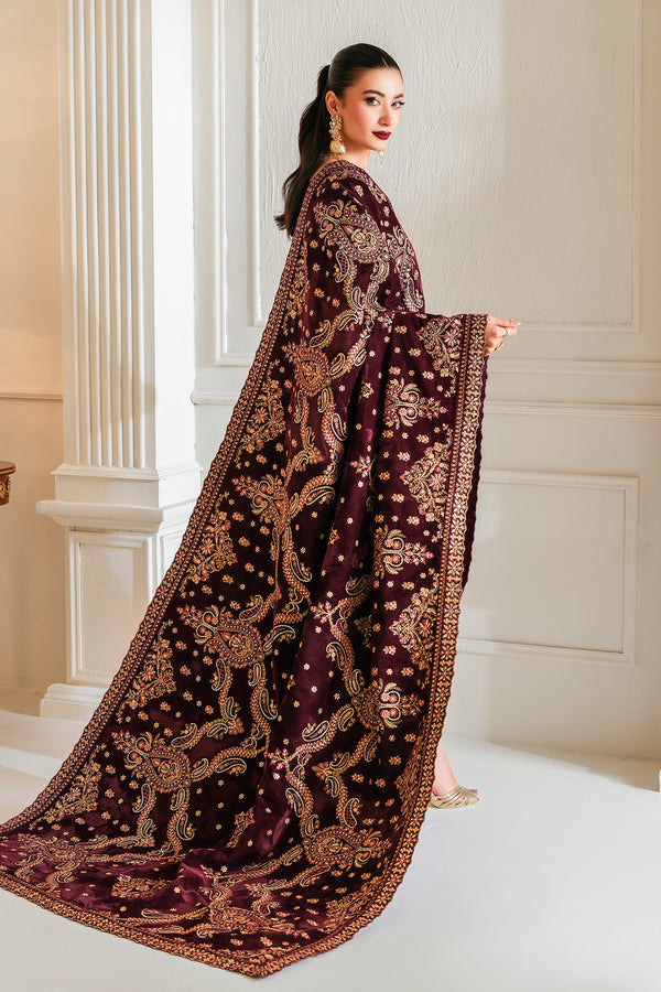 Discrption: This luxurious velvet shawl, expertly crafted from premium-quality plush fabric, exudes opulence through its deep maroon hue and sumptuous gold thread embroidery. Showcasing traditional South Asian artistry, the intricate zari work and sequins feature lavish paisley motifs and delicate floral patterns. The shawl's grandeur and exquisite craftsmanship are further highlighted by its rich texture, meticulous detailing, including small floral dots, and dense border designs, all of which come together to create a masterpiece of elegance.