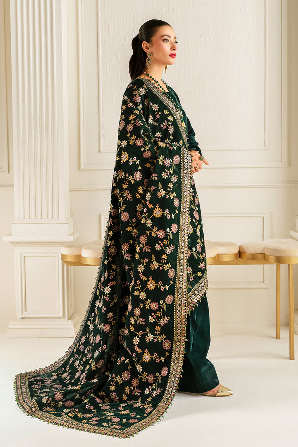 Discrption: This luxurious velvet shawl showcases a profound deep green hue, elegantly complemented by intricate floral embroidery in pink and gold thread work, creating a striking contrast against the rich fabric. The detailed floral motifs add texture and depth, while scalloped edges are further embellished with sequins, beads, and fine gold thread, culminating in an exquisite finish, making it perfect for winter weddings and formal occasions, thanks to its premium velvet construction that drapes beautifully.