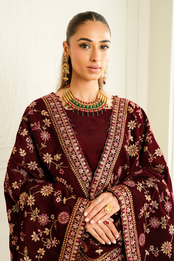 Discrption: This luxurious velvet shawl showcases a profound maroon hue, elegantly complemented by intricate floral embroidery in pink and gold thread work. The striking contrast against the rich fabric creates a breathtaking visual effect. With detailed floral motifs adding texture and depth, scalloped edges are further embellished with sequins, beads, and fine gold thread, culminating in an exquisite finish. Crafted from premium velvet, it drapes effortlessly, rendering it ideal for winter weddings and formal events.