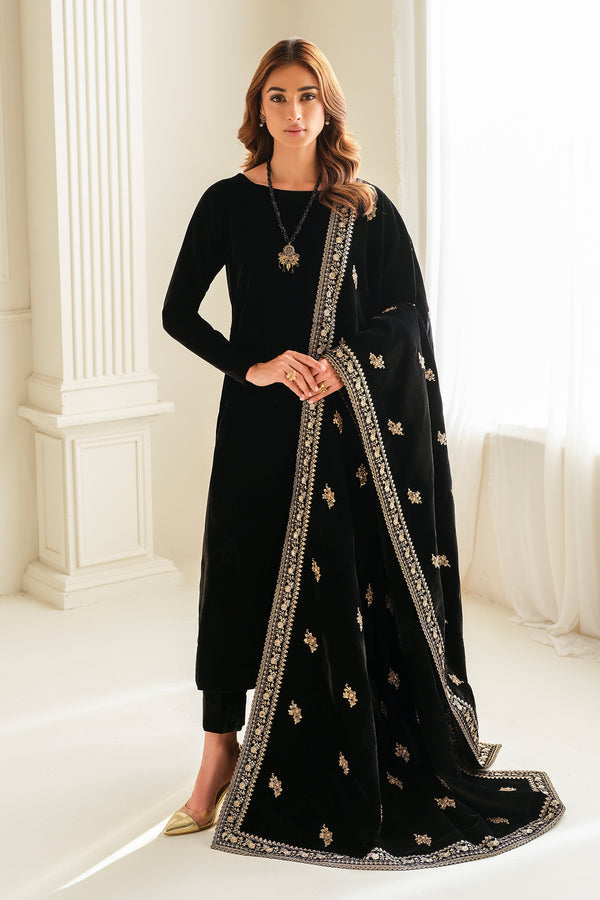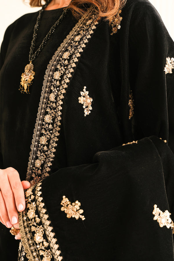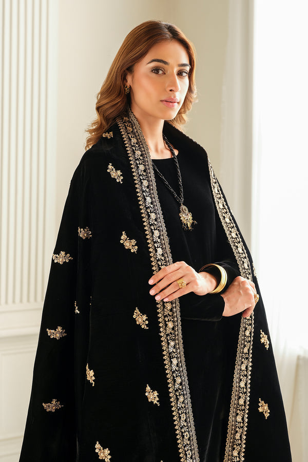 Discrption: This exquisite hand-embroidered black velvet shawl is made from high-quality velvet, providing a plush texture and an elegant drape. Decorated with gold floral motifs, the intricate detailing of sequins and dabka, shines against the rich black fabric. The shawl’s borders are densely embroidered, featuring layered golden zari and sequin work, giving the piece remarkable texture and depth.