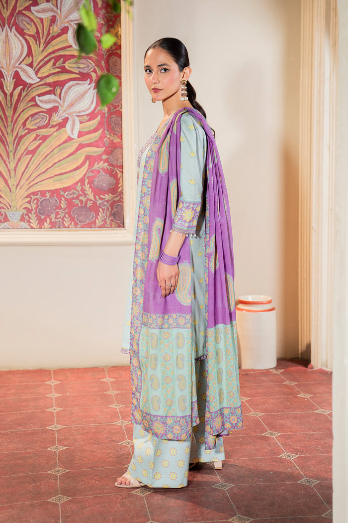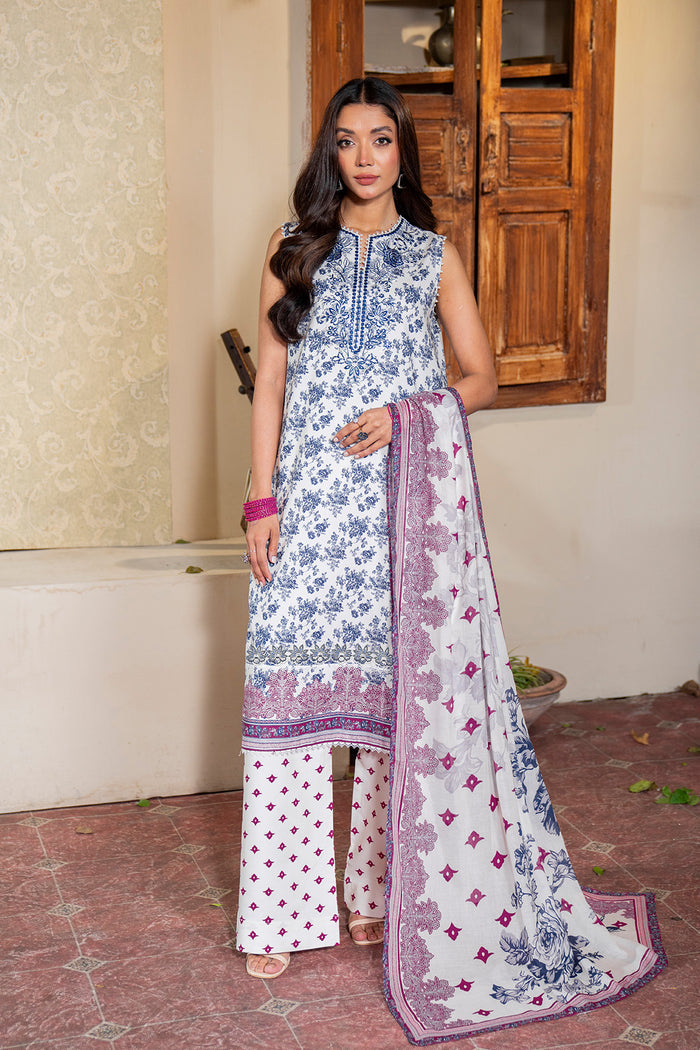 Three piece digital printed / embroidered lawn suits with digital printed lawn dupattas stitched & embellished by Blossoms by Azz.