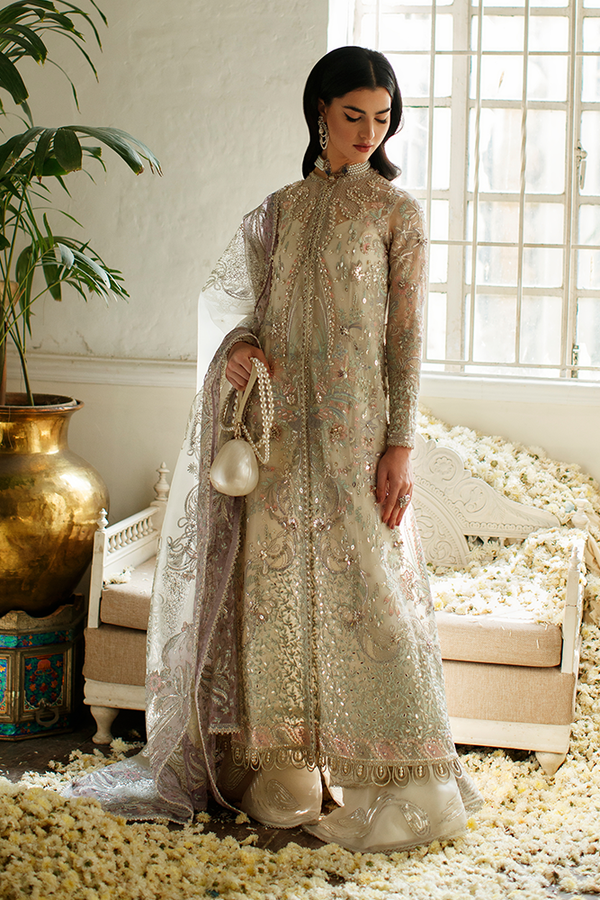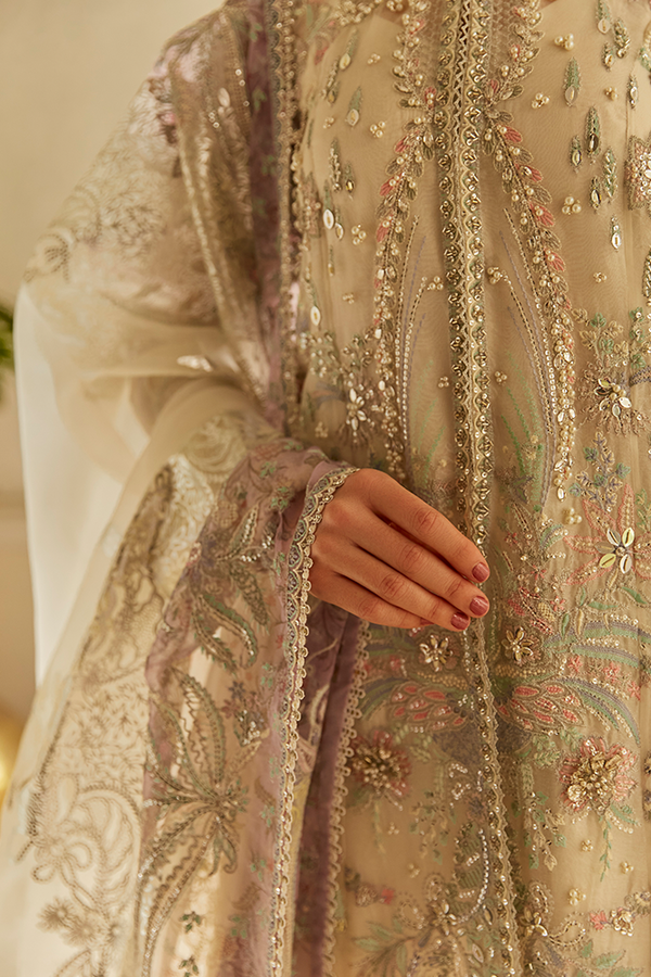 - Front open long organza jacket with pastel coloured embroidery and hand embellishment
