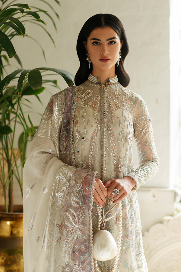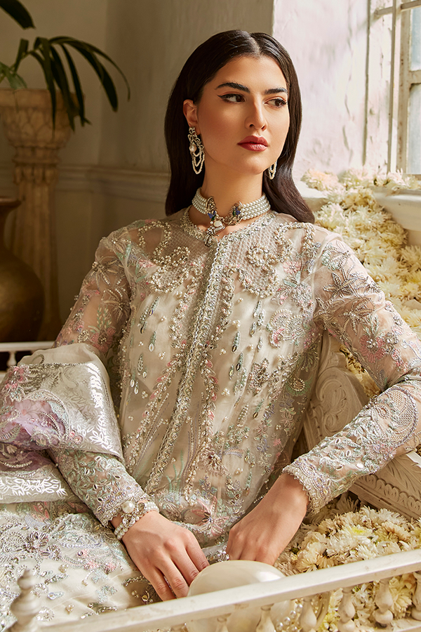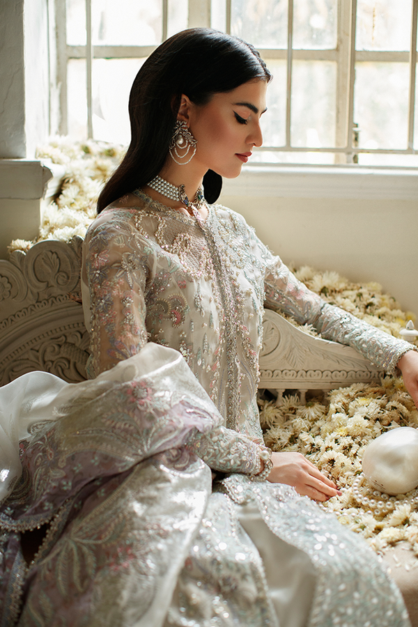 - Silver foil screen printed organza dupatta with digital print accents and embroidered borders all around