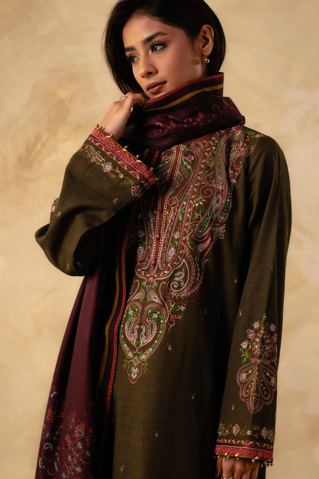 Fabric details: Embroidered khaddar shirt, printed polyester shawl, plain khaddar trouser with embroidered borders